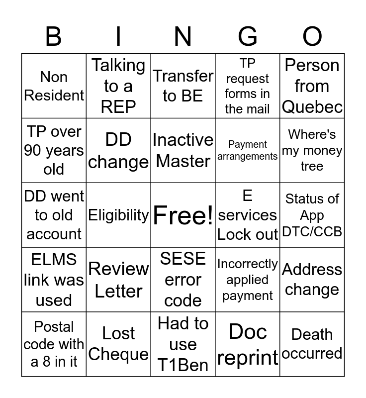 This bingo card has a free space and 24 words: Review Letter, Lost Cheque, Inactive Master, Postal code with a 8 in it, Person from Quebec, Non Resident, TP over 90 years old, Talking to a REP, E services Lock out, SESE error code, Payment arrangements, DD went to old account, Incorrectly applied payment, Address change, DD change, Doc reprint, Status of App DTC/CCB, Transfer to BE, Where's my money tree, Eligibility, Death occurred, ELMS link was used, TP request forms in the mail and Had to use T1Ben.