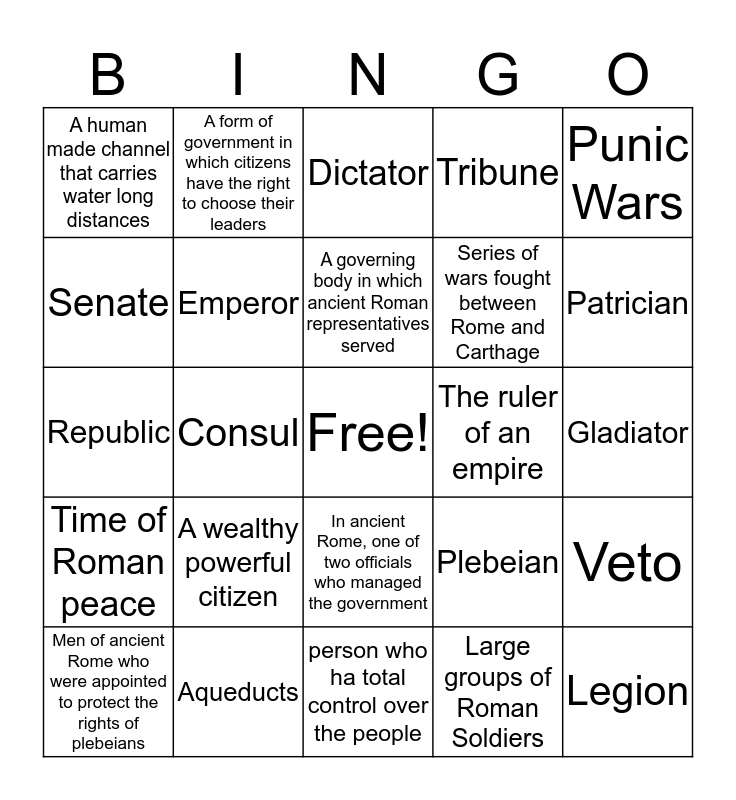 This bingo card has a free space and 30 words: Aqueducts, Caesar, Consul, An ancient Roman emperor, A human made channel that carries water long distances, Dictator, Emperor, In ancient Rome, one of two officials who managed the government, The ruler of an empire, person who ha total control over the people, Gladiator, Legion, Large groups of Roman Soldiers, A professional fighter in ancient Rome, Patrician, Pax Romana, Plebeian, Time of Roman peace, A wealthy powerful citizen, Punic Wars, Republic, A common citizen, A form of government in which citizens have the right to choose their leaders, Series of wars fought between Rome and Carthage, Senate, Tribune, Veto, Men of ancient Rome who were appointed to protect the rights of plebeians, A governing body in which ancient Roman representatives served and To reject.