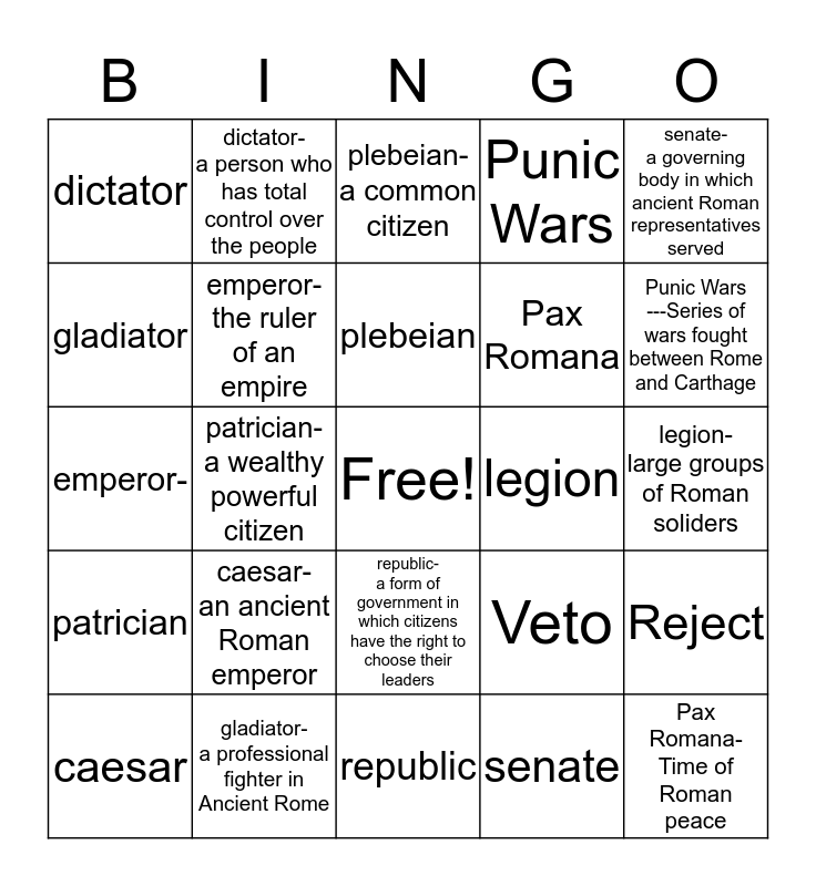 This bingo card has a free space and 24 words: caesar, caesar- an ancient Roman emperor, plebeian, senate, senate- a governing body in which ancient Roman representatives served, dictator, dictator- a person who has total control over the people, plebeian- a common citizen, legion, legion- large groups of Roman soliders, emperor-, emperor- the ruler of an empire, Veto, Reject, gladiator, gladiator- a professional fighter in Ancient Rome, republic, Punic Wars, Punic Wars ---Series of wars fought between Rome and Carthage, patrician, patrician- a wealthy powerful citizen, republic- a form of government in which citizens have the right to choose their leaders, Pax Romana and Pax Romana- Time of Roman peace.