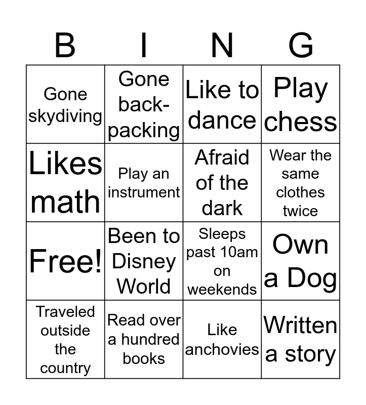 This bingo card has 20 words: Own a Dog, Play a Sport, Like to dance, Know a second language, Traveled outside the country, Likes math, Read over a hundred books, Gone skydiving, Free!, Gone back-packing, Been to Disney World, Sleeps past 10am on weekends, Play an instrument, Written a story, Afraid of the dark, Acted in a play, Wear the same clothes twice, Play chess, Like anchovies and Are a cat person.
