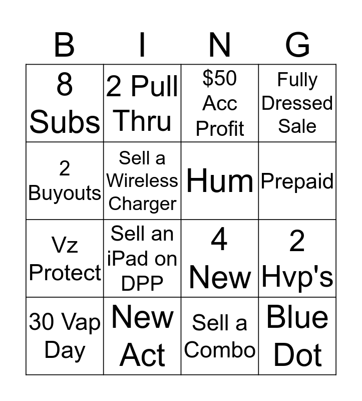This bingo card has 16 words: New Act, 2 Hvp's, $50 Acc Profit, 8 Subs, Vz Protect, 2 Pull Thru, 4 New, Sell a Combo, 2 Buyouts, Sell a Wireless Charger, 30 Vap Day, Fully Dressed Sale, Sell an iPad on DPP, Prepaid, Hum and Blue Dot.
