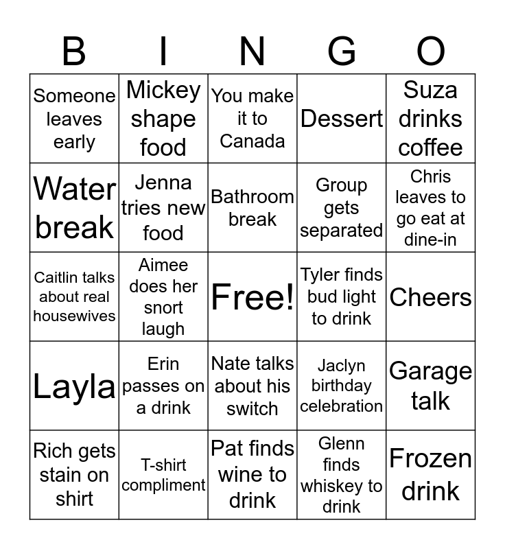 This bingo card has a free space and 29 words: Rich gets stain on shirt, Joyce uses her own cup/straw, Aimee does her snort laugh, Alison spills, Someone leaves early, You make it to Canada, Jenna tries new food, Erin passes on a drink, Tyler finds bud light to drink, T-shirt compliment, Cheers, Frozen drink, Pat finds wine to drink, Glenn finds whiskey to drink, Chris leaves to go eat at dine-in, Dave orders his own food, Nate talks about his switch, Layla, Suza drinks coffee, Caitlin talks about real housewives, Jaclyn birthday celebration, Someone gets lost in country, Group gets separated, Water break, Dessert, Mickey shape food, Garage talk, Bathroom break and Selfie.