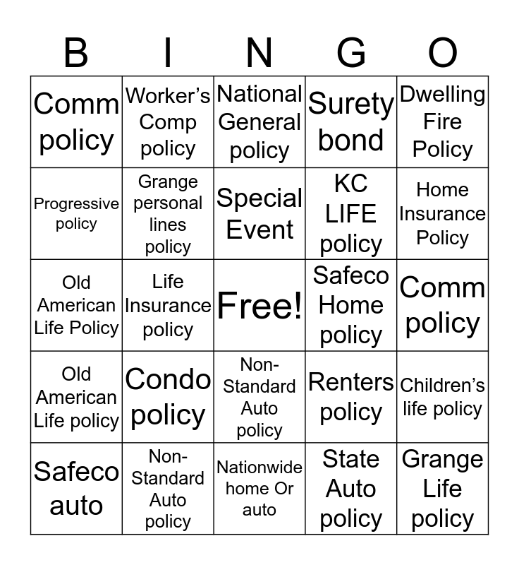 This bingo card has a free space and 29 words: Safeco auto, LTC/Disability submission, Life Insurance policy, Stillwater policy, Comm policy, National General policy, Grange personal lines policy, Condo policy, Safeco Home policy, Non-Standard Auto policy, Comm policy, Grange Life policy, Nationwide home Or auto, State Auto policy, Home Insurance Policy, Travelers home/auto package, Non-Standard Auto policy, Old American Life policy, Dwelling Fire Policy, Old American Life Policy, Renters policy, Guard home Policy, KC LIFE policy, Progressive policy, Surety bond, Worker’s Comp policy, Children’s life policy, Special Event and LTC/Disability submission.