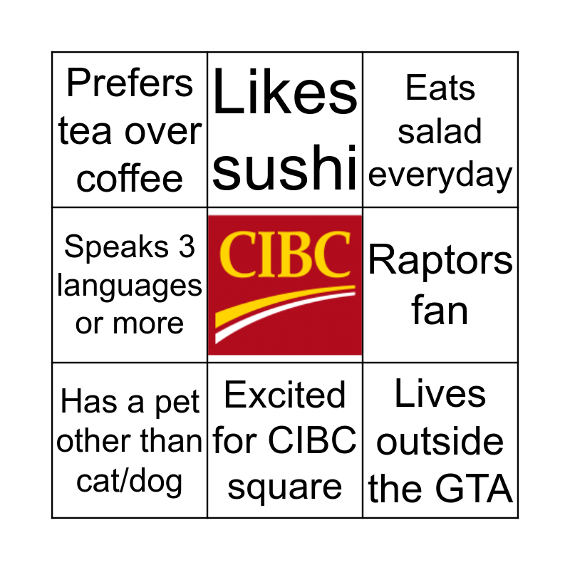 This bingo card has a free space and 8 words: Speaks 3 languages or more, Likes sushi, Raptors fan, Has a pet other than cat/dog, Eats salad everyday, Prefers tea over coffee, Excited for CIBC square and Lives outside the GTA.