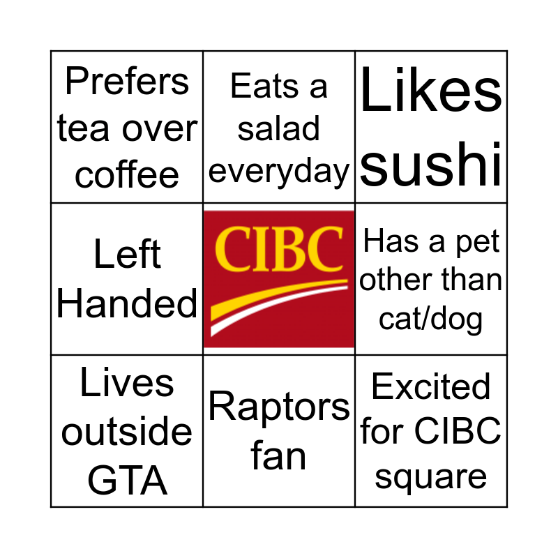 This bingo card has a free space and 8 words: Left Handed, Eats a salad everyday, Has a pet other than cat/dog, Lives outside GTA, Likes sushi, Prefers tea over coffee, Raptors fan and Excited for CIBC square.