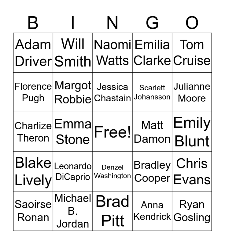 This bingo card has a free space and 25 words: Leonardo DiCaprio, Brad Pitt, Jessica Chastain, Saoirse Ronan, Tom Cruise, Adam Driver, Florence Pugh, Will Smith, Matt Damon, Denzel Washington, Scarlett Johansson, Charlize Theron, Bradley Cooper, Chris Evans, Margot Robbie, Robert Pattinson, Emily Blunt, Naomi Watts, Julianne Moore, Emma Stone, Ryan Gosling, Michael B. Jordan, Blake Lively, Emilia Clarke and Anna Kendrick.