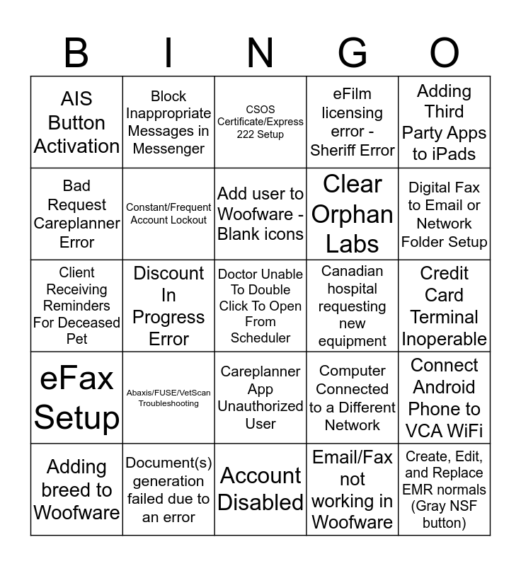 This bingo card has 25 words: Abaxis/FUSE/VetScan Troubleshooting, Account Disabled, Add user to Woofware - Blank icons, Adding breed to Woofware, Adding Third Party Apps to iPads, AIS Button Activation, Bad Request Careplanner Error, Block Inappropriate Messages in Messenger, Canadian hospital requesting new equipment, Careplanner App Unauthorized User, Clear Orphan Labs, Client Receiving Reminders For Deceased Pet, Computer Connected to a Different Network, Connect Android Phone to VCA WiFi, Constant/Frequent Account Lockout, Create, Edit, and Replace EMR normals (Gray NSF button), Credit Card Terminal Inoperable, CSOS Certificate/Express 222 Setup, Digital Fax to Email or Network Folder Setup, Discount In Progress Error, Doctor Unable To Double Click To Open From Scheduler, Document(s) generation failed due to an error, eFax Setup, eFilm licensing error - Sheriff Error and Email/Fax not working in Woofware.