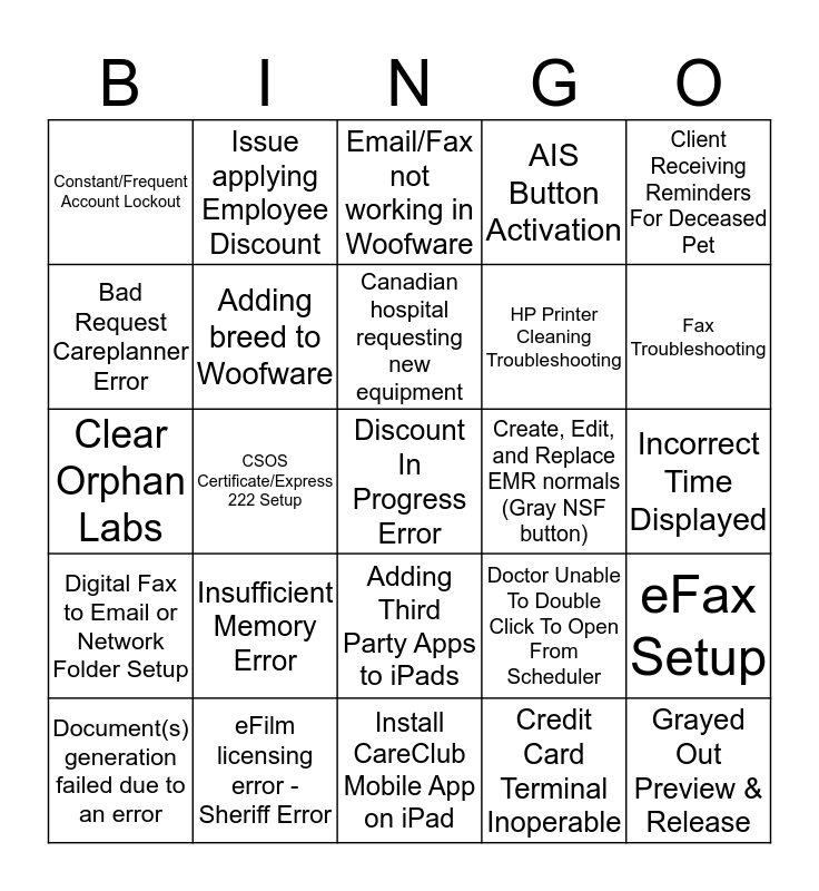 This bingo card has 35 words: Abaxis/FUSE/VetScan Troubleshooting, Account Disabled, Add user to Woofware - Blank icons, Adding breed to Woofware, Adding Third Party Apps to iPads, AIS Button Activation, Bad Request Careplanner Error, Block Inappropriate Messages in Messenger, Canadian hospital requesting new equipment, Careplanner App Unauthorized User, Clear Orphan Labs, Client Receiving Reminders For Deceased Pet, Computer Connected to a Different Network, Connect Android Phone to VCA WiFi, Constant/Frequent Account Lockout, Create, Edit, and Replace EMR normals (Gray NSF button), Credit Card Terminal Inoperable, CSOS Certificate/Express 222 Setup, Digital Fax to Email or Network Folder Setup, Discount In Progress Error, Doctor Unable To Double Click To Open From Scheduler, Document(s) generation failed due to an error, eFax Setup, eFilm licensing error - Sheriff Error, Email/Fax not working in Woofware, Fax Troubleshooting, Grayed Out Preview & Release, HM Account Locked, HP Printer Cleaning Troubleshooting, Incorrect Time Displayed, Install Asepra Connect on NS, Install CareClub Mobile App on iPad, Insufficient Memory Error, Issue applying Employee Discount and Issuing New Virtual Number.