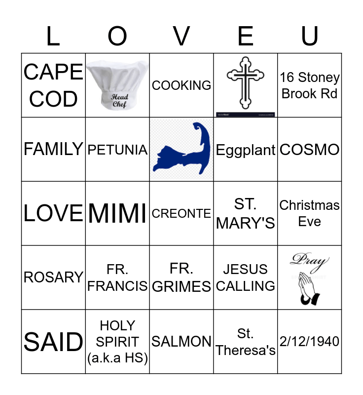 This bingo card has 5 images, a free space and 24 words: SAID, FAA,FAA, FAA'S, MIMI, PAPPA, CAPE COD, COOKING, PETUNIA, FR. FRANCIS, ST. MARY'S, HOLY SPIRIT (a.k.a HS), Christmas Eve, 2/12/1940, SALMON, St. Theresa's, COSMO, FRENCH CANADIAN, FR. GRIMES, ROSARY, 16 Stoney Brook Rd, LOVE, JESUS CALLING, CRV, Eggplant and FAMILY.