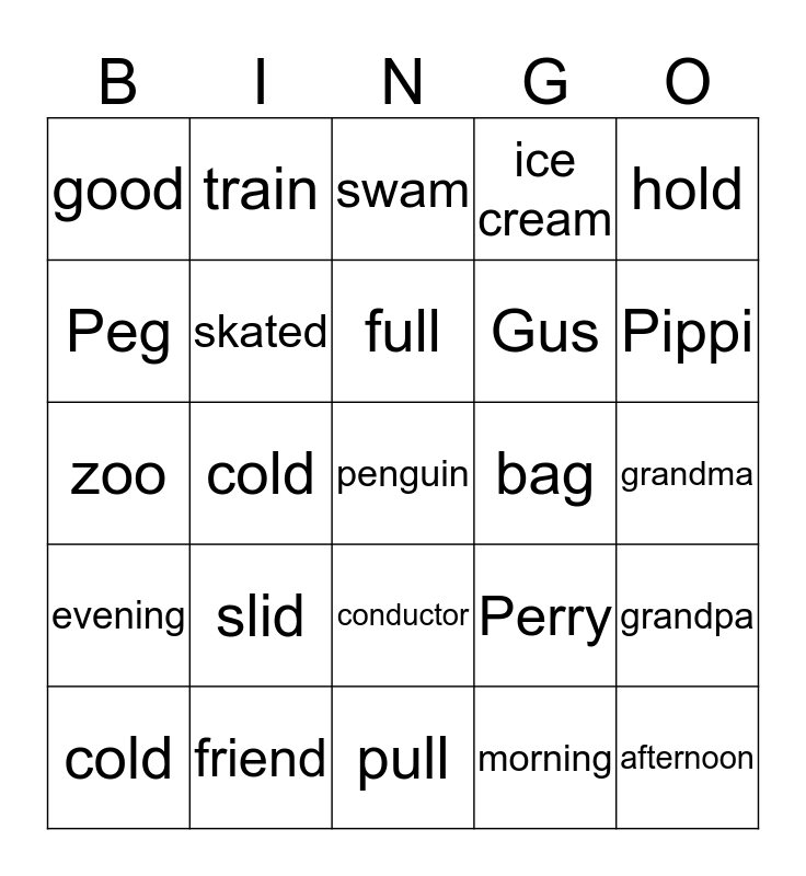 This bingo card has a free space and 24 words: slid, friend, full, cold, hold, good, Peg, train, bag, conductor, Gus, zoo, Perry, grandpa, skated, morning, grandma, swam, Pippi, cold, afternoon, evening, ice cream and pull.