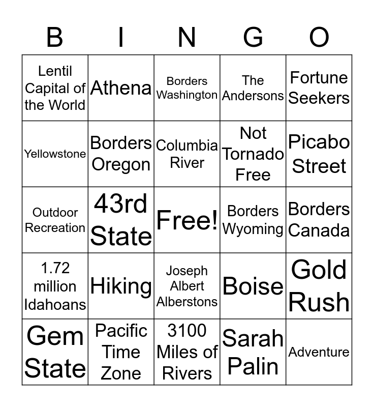This bingo card has a free space and 29 words: Gem State, Potatoes, 43rd State, Land of Many Waters, Lentil Capital of the World, Borders Washington, Borders Oregon, Hiking, Borders Wyoming, Pacific Time Zone, Borders Canada, Adventure, 3100 Miles of Rivers, Sarah Palin, Picabo Street, Lilian Disney, Joseph Albert Alberstons, 1.72 million Idahoans, Fortune Seekers, Outdoor Recreation, Boise, We'll miss you!, Not Tornado Free, Yellowstone, The Andersons, Athena, Gold Rush, Columbia River and Post Falls.