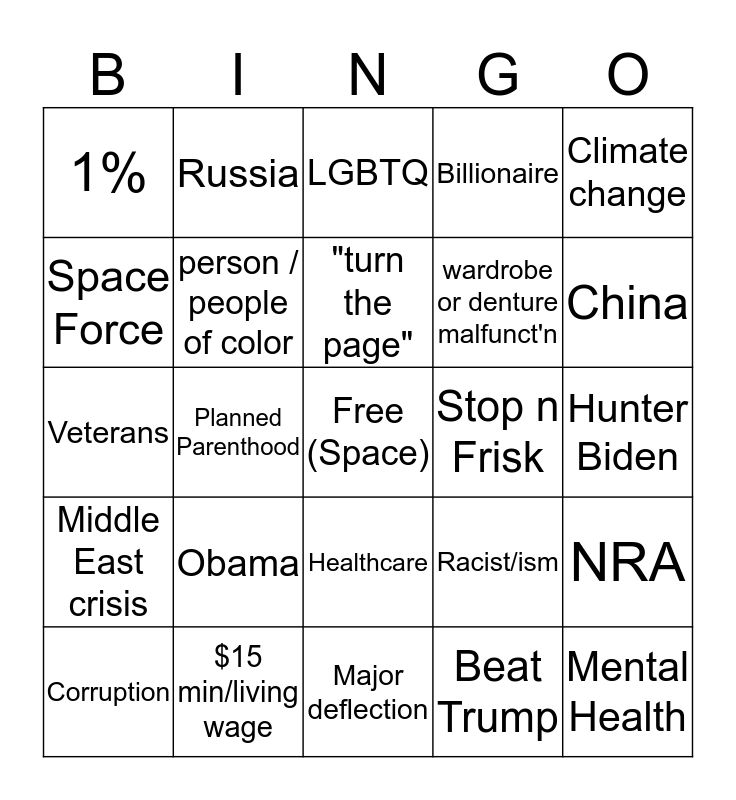 This bingo card has a free space and 44 words: "at the end of the day", Mental Health, Capitalism, Corruption, Awkward moment, Beat Trump, LGBTQ, Bloomberg accused of buying his way in, Climate change, $15 min/living wage, Billionaire, Stop n Frisk, Healthcare, Obama, Guns r bad, mmmk?, Major deflection, Name-drop, Veterans, "how dare you", China, Russia, It's the economy, stupid, Biden gaffe, 1%, Impeach, Hunter Biden, unions, Clinton, Racist/ism, Middle East crisis, opiate epidemic, NRA, Lethal suicide, Pun, Planned Parenthood, Green New Deal, systematic (misuse of "systemic") racism, Star Wars reference, "turn the page", Space Force, wardrobe or denture malfunct'n, electibility, person / people of color and Rowe vs Wade.