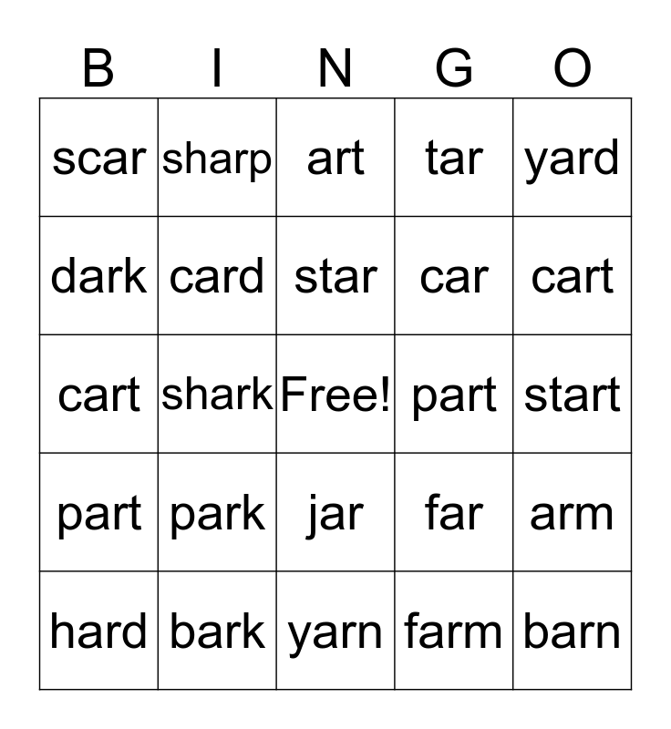 This bingo card has a free space and 24 words: park, bark, star, hard, yard, scar, dark, sharp, part, jar, car, cart, far, arm, card, farm, start, art, cart, shark, barn, part, tar and yarn.