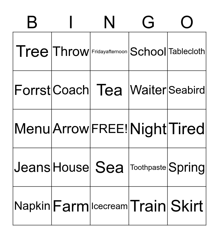 This bingo card has a free space and 24 words: House, Farm, Tea, Napkin, Tablecloth, Tree, Forrst, Throw, Night, Sea, Waiter, Menu, Toothpaste, Spring, Coach, Train, Tired, Fridayafternoon, Seabird, Arrow, Skirt, Jeans, School and Icecream.