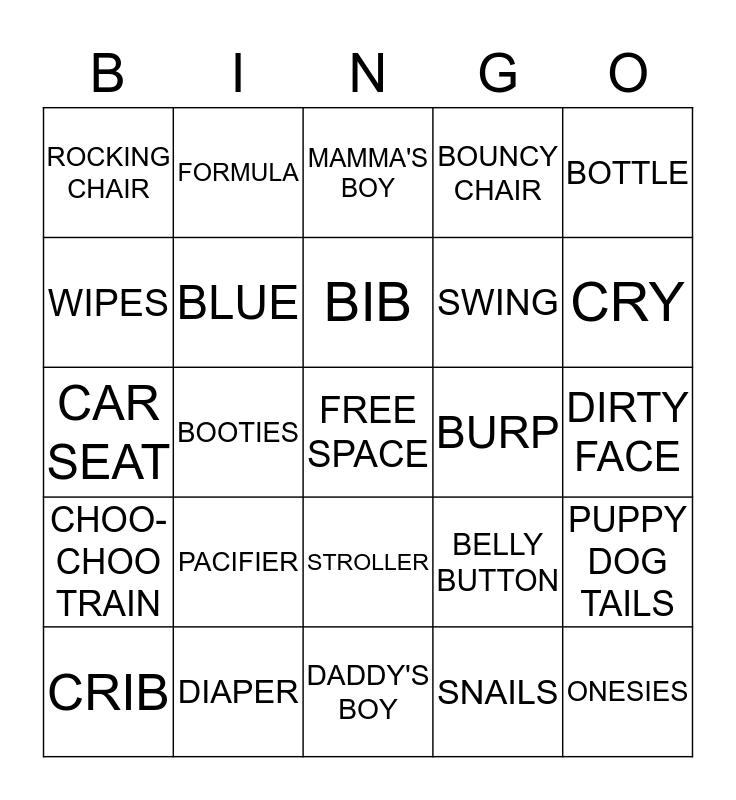 This bingo card has a free space and 24 words: PACIFIER, DIAPER, BIB, CRIB, BOTTLE, ROCKING CHAIR, WIPES, FORMULA, BURP, STROLLER, SWING, CAR SEAT, BELLY BUTTON, PUPPY DOG TAILS, BLUE, SNAILS, DIRTY FACE, MAMMA'S BOY, CRY, BOOTIES, ONESIES, CHOO-CHOO TRAIN, BOUNCY CHAIR and DADDY'S BOY.