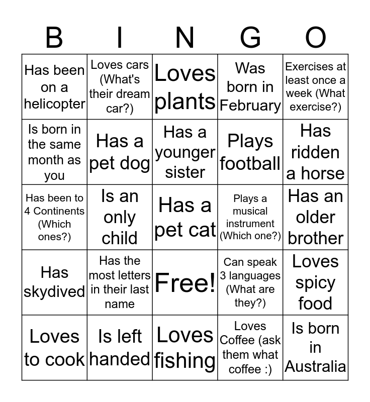 This bingo card has 26 words: Free!, Loves Coffee (ask them what coffee :), Has a younger sister, Is left handed, Exercises at least once a week (What exercise?), Has been on a helicopter, Is born in the same month as you, Loves cars (What's their dream car?), Has an older brother, Can speak 3 languages (What are they?), Plays football, Has been to 4 Continents (Which ones?), Loves spicy food, Loves to cook, Is an only child, Loves to play video games (Which games?), Was born in February, Has skydived, Loves plants, Has a pet cat, Has ridden a horse, Loves fishing, Plays a musical instrument (Which one?), Has the most letters in their last name, Has a pet dog and Is born in Australia.