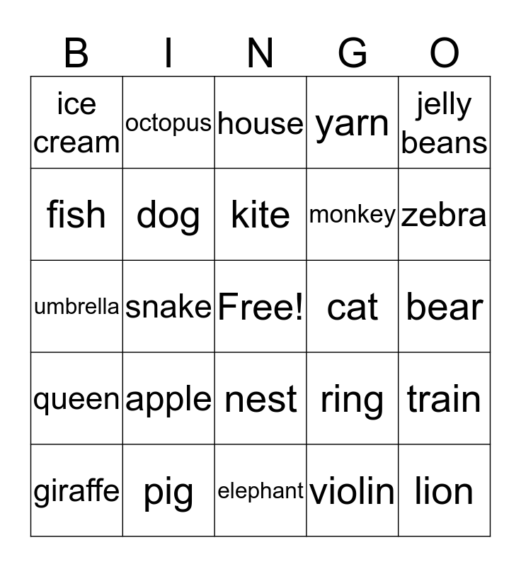 This bingo card has a free space and 24 words: apple, pig, kite, giraffe, jelly beans, ice cream, fish, octopus, cat, nest, monkey, umbrella, ring, train, dog, violin, bear, house, zebra, snake, lion, queen, yarn and elephant.