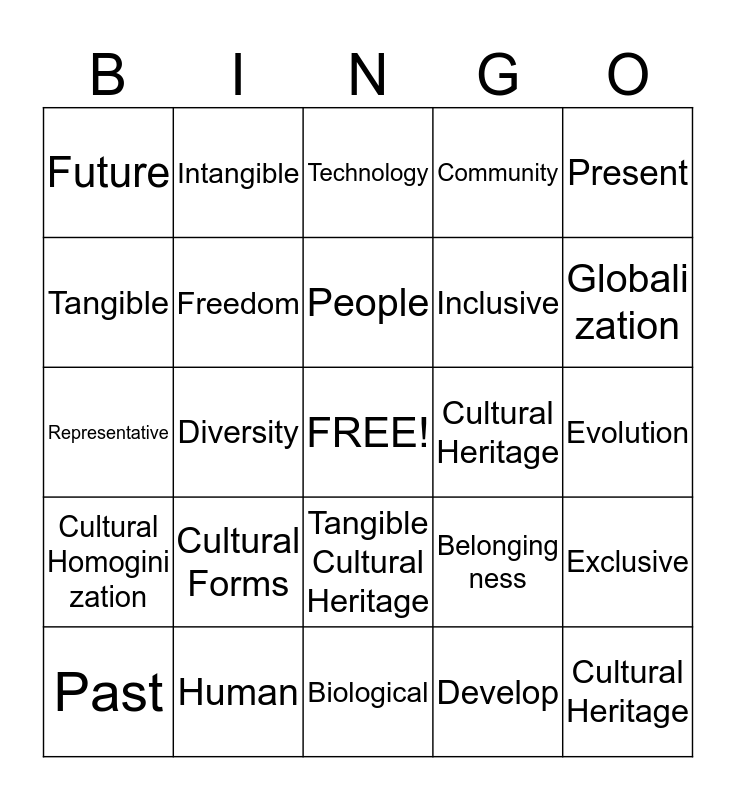This bingo card has a free space and 24 words: Cultural Forms, Human, People, Past, Present, Future, Tangible, Intangible, Cultural Heritage, Tangible Cultural Heritage, Inclusive, Representative, Belonging ness, Exclusive, Freedom, Develop, Evolution, Technology, Globali zation, Diversity, Cultural Heritage, Cultural Homogini zation, Community and Biological.
