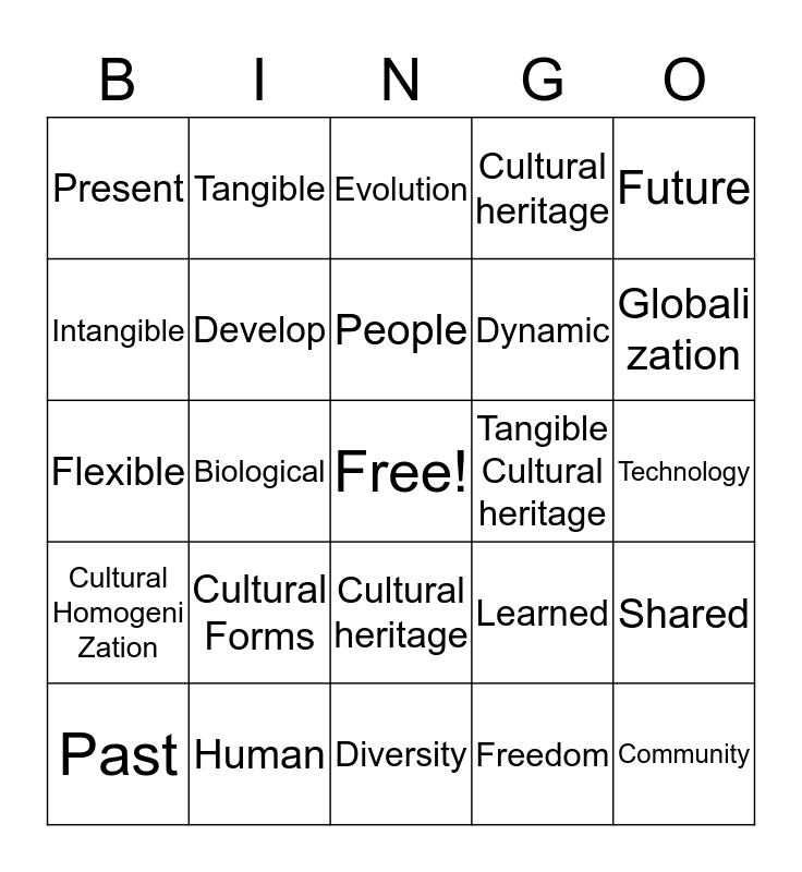 This bingo card has a free space and 24 words: Cultural Forms, Human, People, Past, Future, Present, Intangible, Tangible, Tangible Cultural heritage, Cultural heritage, Dynamic, Flexible, Learned, Shared, Develop, Freedom, Technology, Evolution, Globali zation, Biological, Community, Cultural Homogeni Zation, Cultural heritage and Diversity.