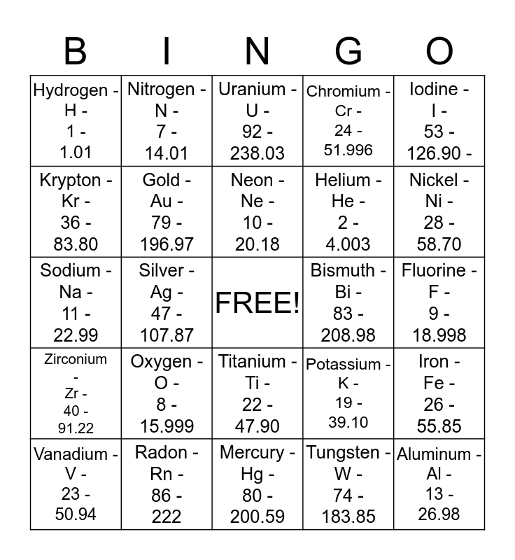 This bingo card has a free space and 24 words: Oxygen - O - 8 - 15.999, Radon - Rn - 86 - 222, Neon - Ne - 10 - 20.18, Vanadium - V - 23 - 50.94, Iodine - I - 53 - 126.90 -, Hydrogen - H - 1 - 1.01, Krypton - Kr - 36 - 83.80, Nitrogen - N - 7 - 14.01, Bismuth - Bi - 83 - 208.98, Titanium - Ti - 22 - 47.90, Helium - He - 2 - 4.003, Sodium - Na - 11 - 22.99, Potassium - K - 19 - 39.10, Iron - Fe - 26 - 55.85, Gold - Au - 79 - 196.97, Tungsten - W - 74 - 183.85, Fluorine - F - 9 - 18.998, Uranium - U - 92 - 238.03, Nickel - Ni - 28 - 58.70, Silver - Ag - 47 - 107.87, Aluminum - Al - 13 - 26.98, Zirconium - Zr - 40 - 91.22, Chromium - Cr - 24 - 51.996 and Mercury - Hg - 80 - 200.59.