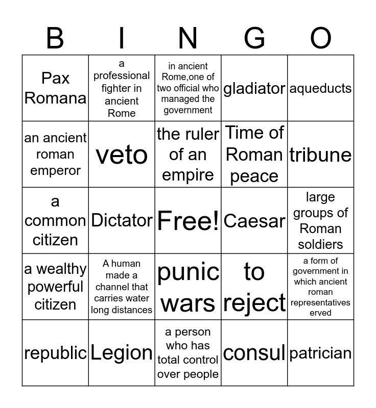 This bingo card has a free space and 24 words: A human made a channel that carries water long distances, Legion, the ruler of an empire, republic, aqueducts, Pax Romana, an ancient roman emperor, a professional fighter in ancient Rome, Caesar, punic wars, Time of Roman peace, a common citizen, to reject, a form of government in which ancient roman representatives erved, veto, consul, large groups of Roman soldiers, in ancient Rome,one of two official who managed the government, tribune, Dictator, patrician, a wealthy powerful citizen, gladiator and a person who has total control over people.