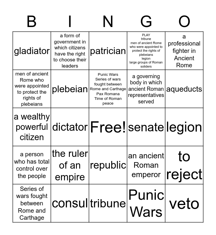 This bingo card has a free space and 30 words: consul, consul, dictator, emperor, gladiator, patrician, plebeian, republic, senate, tribune, legion, veto, Punic Wars, Pax Romana, aqueducts, in ancient Rome, one of two officials who manged the government, an ancient Roman emperor, a person who has total control over the people, the ruler of an empire, a professional fighter in Ancient Rome, a wealthy powerful citizen, a common citizen, a form of government in which citizens have the right to choose their leaders, a governing body in which ancient Roman representatives served, men of ancient Rome who were appointed to protect the rights of plebeians, PLAY tribune men of ancient Rome who were appointed to protect the rights of plebeians legion large groups of Roman soliders, to reject, Series of wars fought between Rome and Carthage, Punic Wars Series of wars fought between Rome and Carthage Pax Romana Time of Roman peace and a human made channel that carries water long distances.