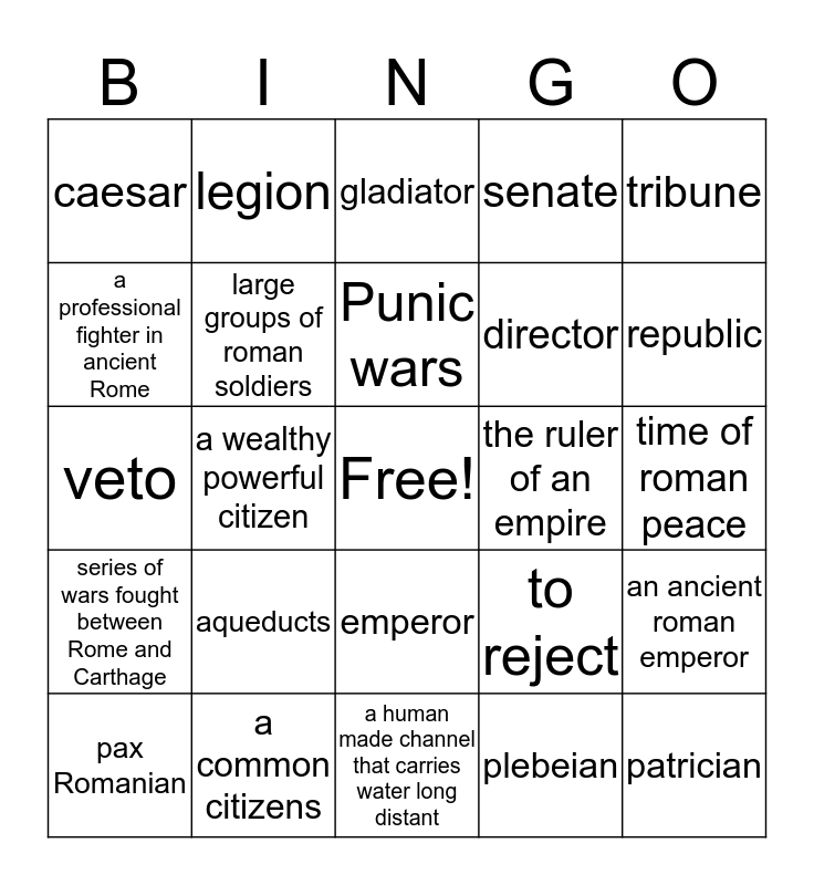 This bingo card has a free space and 24 words: aqueducts, a common citizens, Punic wars, pax Romanian, tribune, caesar, a professional fighter in ancient Rome, legion, the ruler of an empire, emperor, director, veto, to reject, an ancient roman emperor, large groups of roman soldiers, plebeian, time of roman peace, gladiator, republic, a wealthy powerful citizen, patrician, series of wars fought between Rome and Carthage, senate and a human made channel that carries water long distant.
