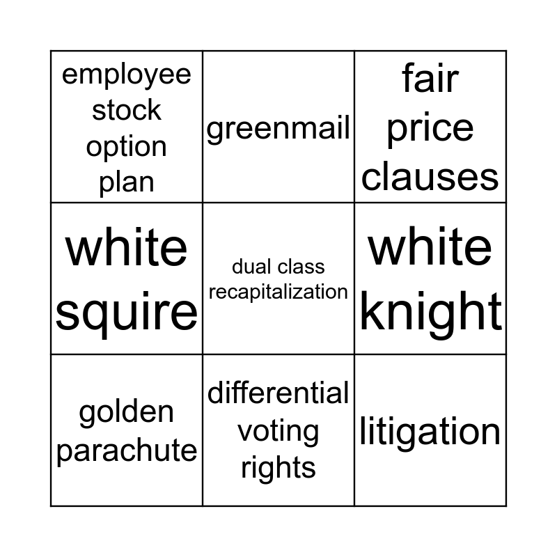 This bingo card has 15 words: staggered boards, supermajority, fair price clauses, employee stock option plan, differential voting rights, dual class recapitalization, moving, scorched earth policies, white knight, litigation, poison pill, white squire, golden parachute, greenmail and regulatory approval.