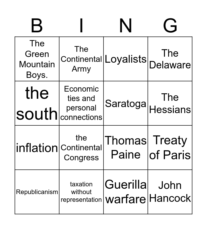 This bingo card has 20 words: Republicanism, raw materials, Loyalists, Treaty of Paris, the french, the Continental Congress, Guerilla warfare, The Delaware, inflation, The Continental Army, Thomas Paine, The Hessians, The Green Mountain Boys., taxation without representation, Saratoga, George Washington, the south, Economic ties and personal connections, July 2nd and John Hancock.