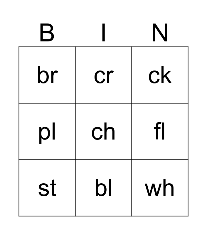 This bingo card has 12 words: sh, wh, ch, fl, cr, ck, bl, l, br, pl, st and th.