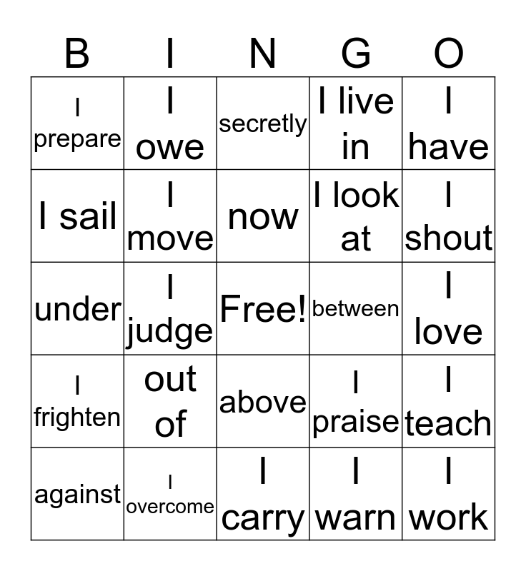 This bingo card has a free space and 32 words: I warn, I prevent, I judge, I see, I frighten, I move, I have, I teach, I owe, I order, now, secretly, not, well, between, never, against, under, above, out of, I praise, I pray, I love, I overcome, I work, I live in, I look at, I sail, I prepare, I carry, I call and I shout.