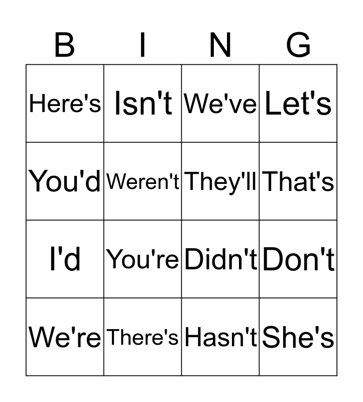 This bingo card has 16 words: There's, Don't, We've, Here's, I'd, Isn't, Didn't, Hasn't, You'd, Weren't, We're, Let's, You're, That's, They'll and She's.
