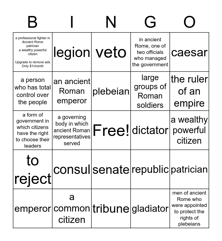 This bingo card has a free space and 24 words: consul, a common citizen, plebeian, emperor, caesar, a professional fighter in Ancient Rome patrician a wealthy powerful citizen Upgrade to remove ads Only $1/month, a person who has total control over the people, legion, dictator, senate, large groups of Roman soldiers, a form of government in which citizens have the right to choose their leaders, republic, patrician, an ancient Roman emperor, gladiator, a wealthy powerful citizen, veto, the ruler of an empire, a governing body in which ancient Roman representatives served, men of ancient Rome who were appointed to protect the rights of plebeians, to reject, in ancient Rome, one of two officials who managed the government and tribune.