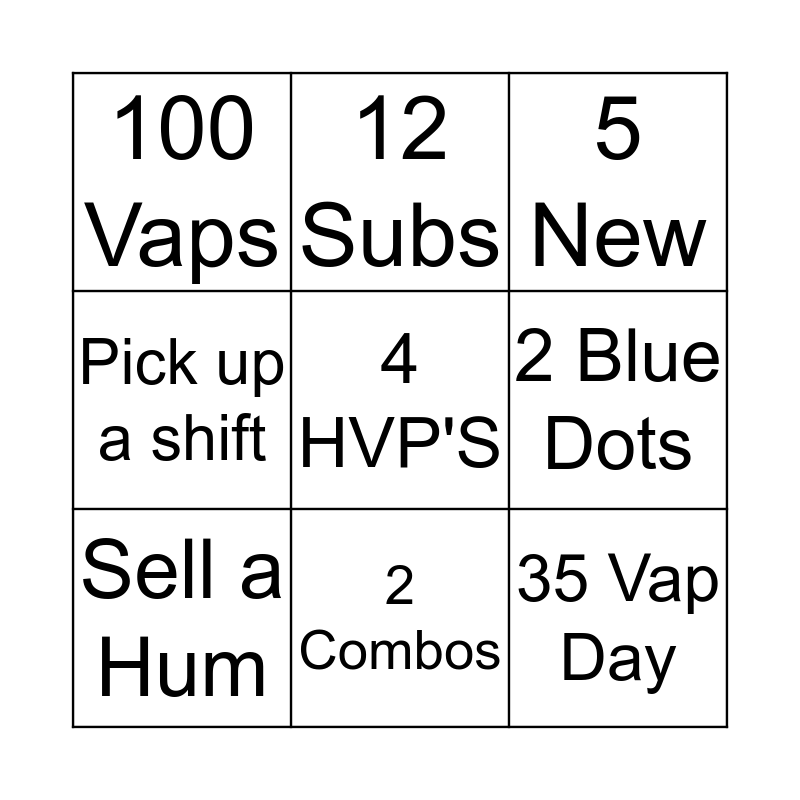 This bingo card has 9 words: Sell a Hum, 5 New, 12 Subs, Pick up a shift, 100 Vaps, 2 Blue Dots, 4 HVP'S, 35 Vap Day and 2 Combos.