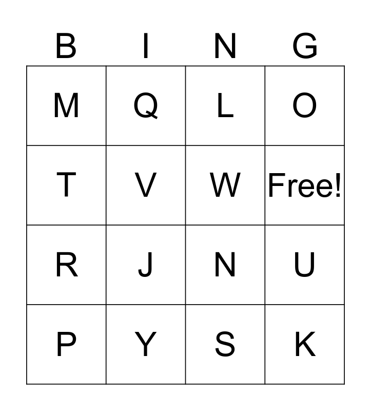 This bingo card has 18 words: J, K, L, M, N, O, P, Q, Free!, R, S, T, U, V, W, X, Y and Z.