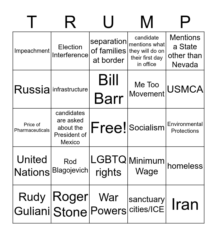 This bingo card has a free space and 24 words: Rod Blagojevich, Roger Stone, Bill Barr, Rudy Guliani, Mentions a State other than Nevada, Impeachment, Russia, Election Interference, Socialism, LGBTQ rights, Me Too Movement, Price of Pharmaceuticals, Minimum Wage, homeless, infrastructure, sanctuary cities/ICE, Environmental Protections, separation of families at border, USMCA, candidates are asked about the President of Mexico, Iran, United Nations, candidate mentions what they will do on their first day in office and War Powers.