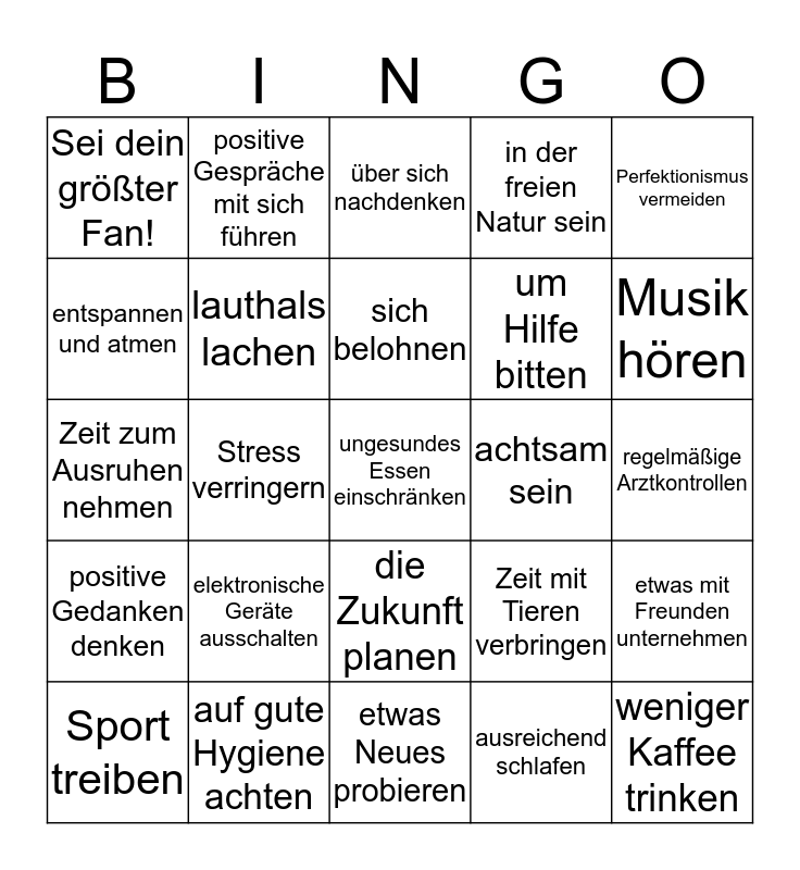 This bingo card has a free space and 28 words: etwas mit Freunden unternehmen, Tagebuch schreiben, um Hilfe bitten, ausreichend schlafen, entspannen und atmen, über sich nachdenken, positive Gespräche mit sich führen, positive Gedanken denken, achtsam sein, Sport treiben, Zeit zum Ausruhen nehmen, in der freien Natur sein, auf gute Hygiene achten, etwas Neues probieren, Musik hören, lesen, elektronische Geräte ausschalten, lauthals lachen, sich belohnen, die Zukunft planen, Sei dein größter Fan!, schlechte Einflüsse loswerden, weniger Kaffee trinken, Stress verringern, regelmäßige Arztkontrollen, Zeit mit Tieren verbringen, Perfektionismus vermeiden and Übung.
