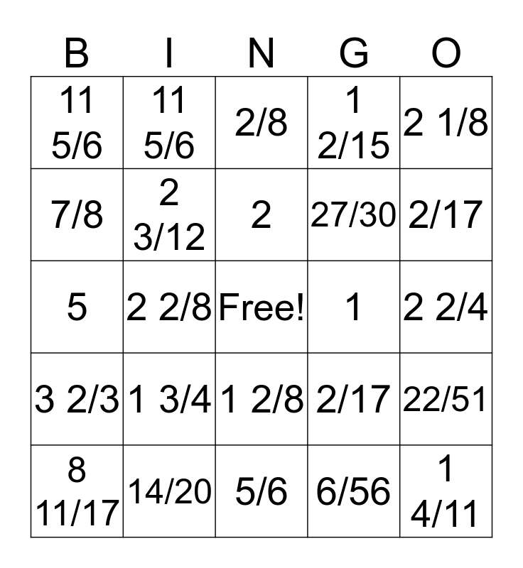 This bingo card has a free space and 24 words: 1 3/4, 14/20, 2, 8 11/17, 2 1/8, 11 5/6, 7/8, 11 5/6, 1, 1 2/8, 27/30, 5, 2/17, 22/51, 2 3/12, 6/56, 2 2/4, 2/8, 2/17, 2 2/8, 1 4/11, 3 2/3, 1 2/15 and 5/6.