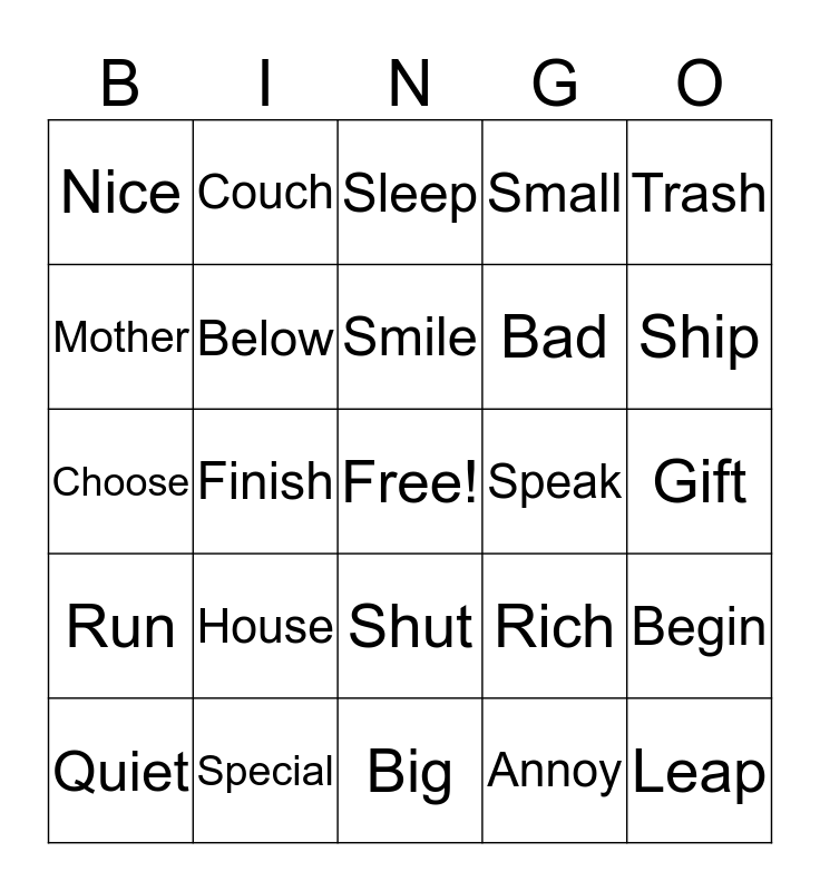 This bingo card has a free space and 24 words: House, Special, Smile, Quiet, Trash, Nice, Mother, Couch, Speak, Shut, Bad, Choose, Rich, Begin, Below, Annoy, Gift, Sleep, Ship, Finish, Leap, Run, Small and Big.
