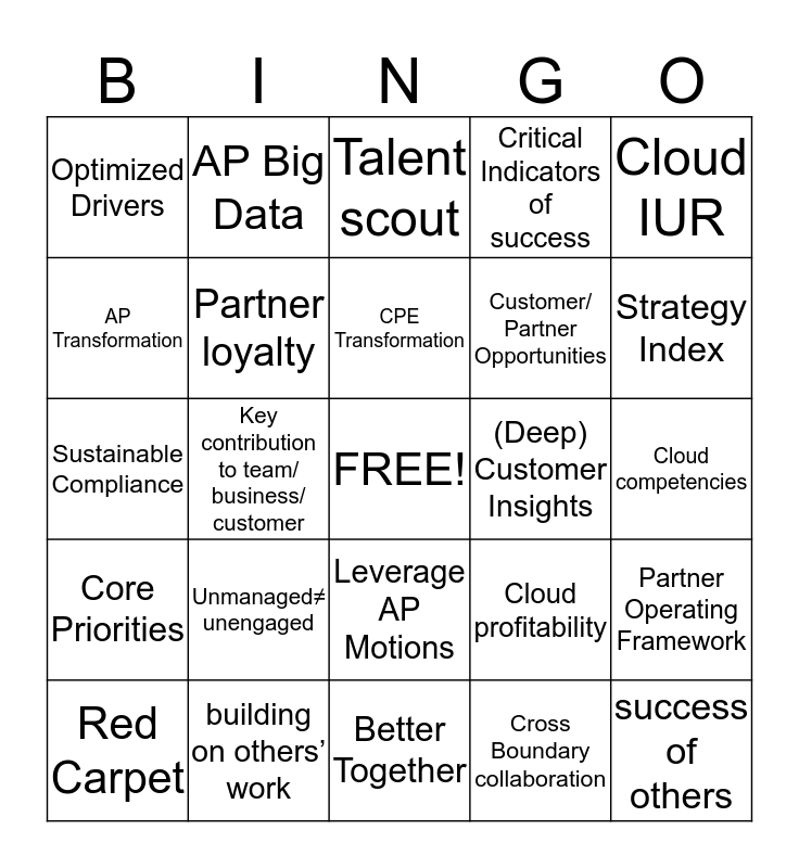 This bingo card has a free space and 25 words: Unmanaged≠ unengaged, Better Together, CPE Transformation, Red Carpet, Cloud IUR, Optimized Drivers, AP Transformation, AP Big Data, (Deep) Customer Insights, Leverage AP Motions, Customer/ Partner Opportunities, Sustainable Compliance, Cloud profitability, Partner Operating Framework, Partner loyalty, Capacity management, Cloud competencies, Talent scout, Strategy Index, Key contribution to team/ business/ customer, success of others, building on others’ work, Core Priorities, Critical Indicators of success and Cross Boundary collaboration.