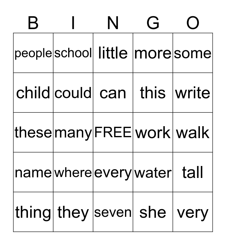 This bingo card has a free space and 24 words: where, they, can, thing, some, people, child, school, work, every, this, these, water, tall, could, she, walk, little, write, many, very, name, more and seven.