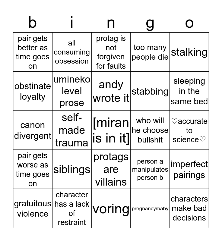 This bingo card has a free space and 24 words: siblings, character has a lack of restraint, andy wrote it, gratuitous violence, stalking, pair gets better as time goes on, obstinate loyalty, all consuming obsession, who will he choose bullshit, protags are villains, stabbing, canon divergent, person a manipulates person b, imperfect pairings, umineko level prose, pregnancy/baby, ♡accurate to science♡, protag is not forgiven for faults, sleeping in the same bed, self-made trauma, characters make bad decisions, pair gets worse as time goes on, too many people die and voring.