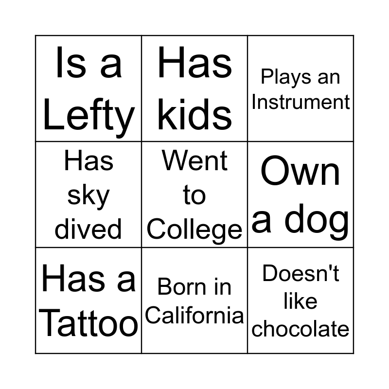 This bingo card has a free space and 8 words: Own a dog, Plays an Instrument, Has kids, Has a Tattoo, Is a Lefty, Doesn't like chocolate, Has sky dived and Born in California.