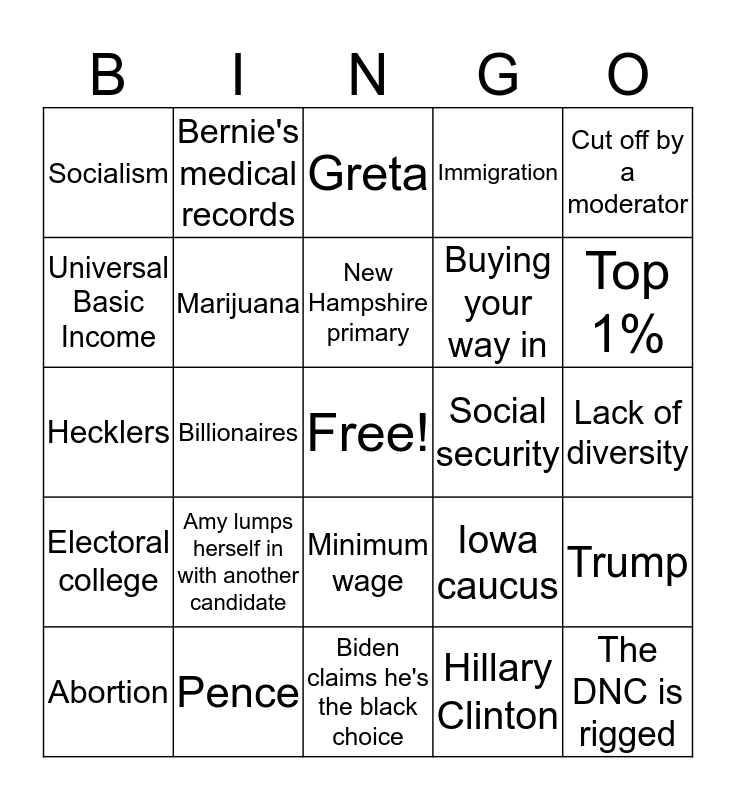 This bingo card has a free space and 35 words: Impeachment, Ukraine, Medicare for all, Marijuana, Minimum wage, Immigration, Universal Basic Income, Obama, New Hampshire primary, Someone plugs their campaign website, Hecklers, Cut off by a moderator, Green New Deal, Student debt, Socialism, Social security, Hillary Clinton, Billionaires, Electoral college, The DNC is rigged, Iowa caucus, Abortion, Trump, Pence, Greta, Top 1%, Purity test, Coronavirus, Buying your way in, Lack of diversity, Bloomberg's sketchy ads, Biden claims he's the black choice, Amy lumps herself in with another candidate, Bernie's medical records and Someone defends billionaires.