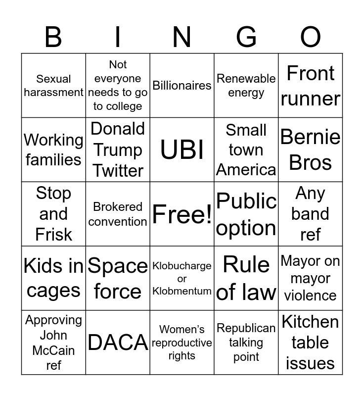 This bingo card has a free space and 34 words: Dark money, Republican talking point, Medicare for all, Student debt, Kids in cages, Donald Trump Twitter, Front runner, Approving John McCain ref, Not everyone needs to go to college, Green new deal, UBI, Billionaires, BLM, Infrastructure, Public option, Bernie Bros, DACA, Stop and Frisk, Space force, Rule of law, Klobucharge or Klobmentum, 1%, Sexual harassment, Any band ref, Women’s reproductive rights, Kitchen table issues, Renewable energy, Common sense gun legislation/control, Small town America, Working families, Brave impeachment witnesses, Brokered convention, Mayor on mayor violence and Founding fathers.