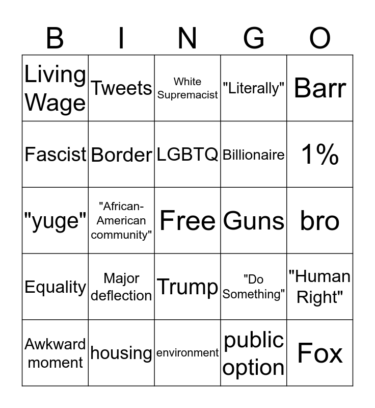 This bingo card has a free space and 39 words: Medicare for all, Medicare for all who want it, Medical records, Border, Awkward moment, Trump, LGBTQ, buyinh elections, Barr, Equality, "African-American community", "Literally", Fox, bro, Guns, Major deflection, Reparations, Living Wage, Trans-rights, "Do Something", Fascist, environment, Billionaire, 1%, "Corporations", "Party of the Working Class", unions, Free college, Racist/ism, Tweets, "Inclusion", Gay Rights, White Supremacist, housing, public option, 99%, "Human Right", "yuge" and trade.