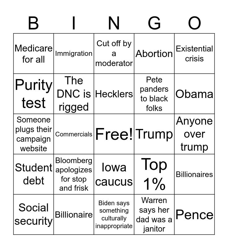 This bingo card has a free space and 33 words: Buying the election, Hillary Clinton, Commercials, Misrepresenting medicare for all, Student debt, The DNC is rigged, Existential crisis, Social security, Immigration, Marijuana, Hecklers, Cut off by a moderator, Socialism, Electoral college, Trump, Obama, Billionaire, Someone plugs their campaign website, Bloomberg apologizes for stop and frisk, Top 1%, Iowa caucus, Greta, Medicare for all, Anyone over trump, Biden says something culturally inappropriate, Pence, Abortion, Pete panders to black folks, Purity test, Billionaires, Minimum wage, Warren says her dad was a janitor and Coronavirus.