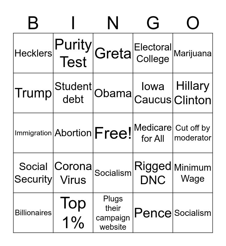 This bingo card has a free space and 24 words: Corona Virus, Top 1%, Obama, Billionaires, Marijuana, Hecklers, Trump, Purity Test, Medicare for All, Socialism, Iowa Caucus, Immigration, Rigged DNC, Minimum Wage, Student debt, Pence, Cut off by moderator, Greta, Hillary Clinton, Abortion, Socialism, Social Security, Electoral College and Plugs their campaign website.