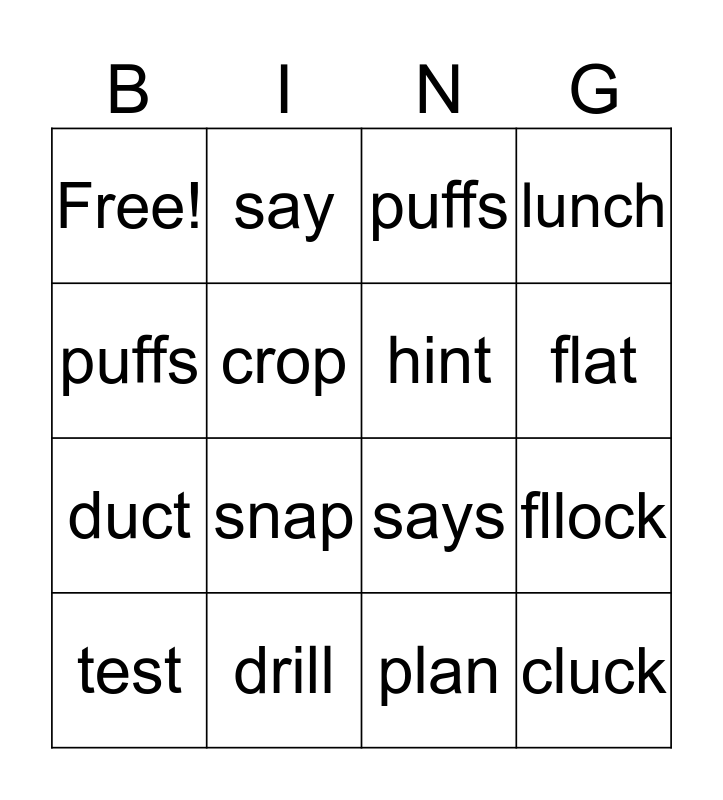 This bingo card has 16 words: test, drill, puffs, lunch, puffs, say, says, fllock, Free!, crop, plan, flat, duct, snap, hint and cluck.