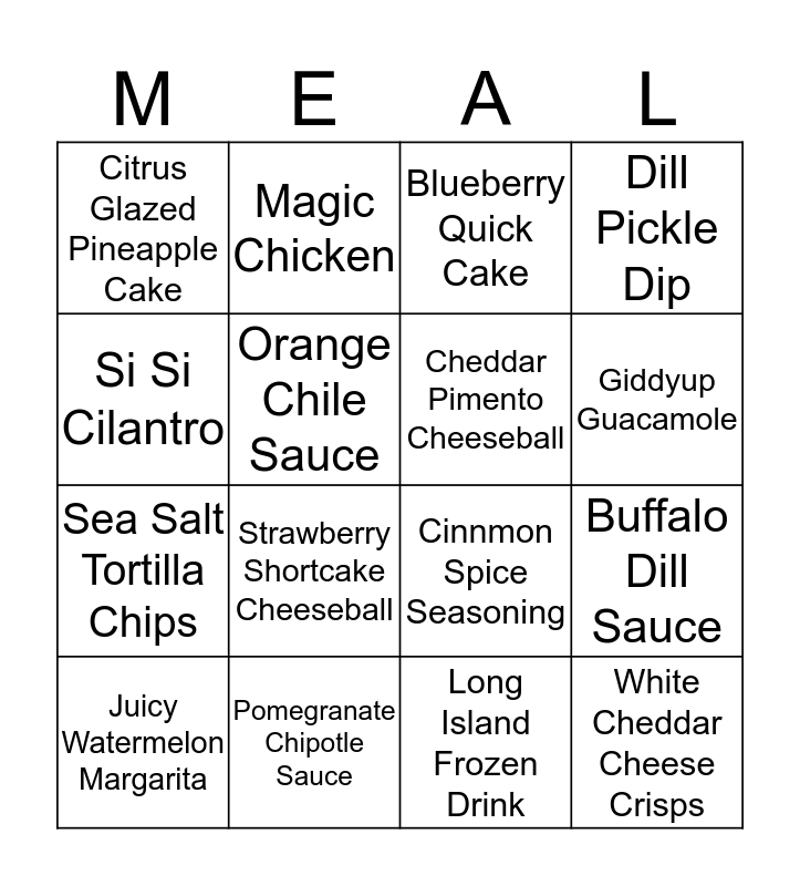 This bingo card has 17 words: Long Island Frozen Drink, Juicy Watermelon Margarita, Blueberry Quick Cake, Citrus Glazed Pineapple Cake, Strawberry Shortcake Cheeseball, Dill Pickle Dip, Buffalo Dill Sauce, Cheddar Pimento Cheeseball, Giddyup Guacamole, Orange Chile Sauce, Pomegranate Chipotle Sauce, Cinnmon Spice Seasoning, Si Si Cilantro, Magic Chicken, Sea Salt Tortilla Chips, Smoky Ranch Sunflower Kernels and White Cheddar Cheese Crisps.